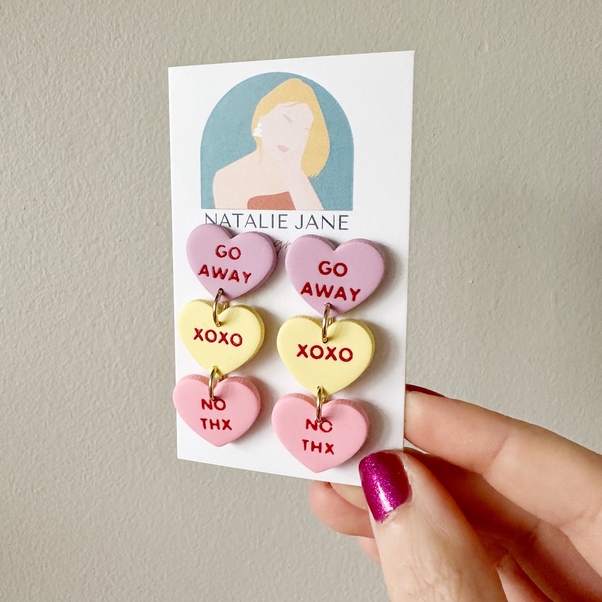 The phrases are a red acrylic paint on the polymer clay.