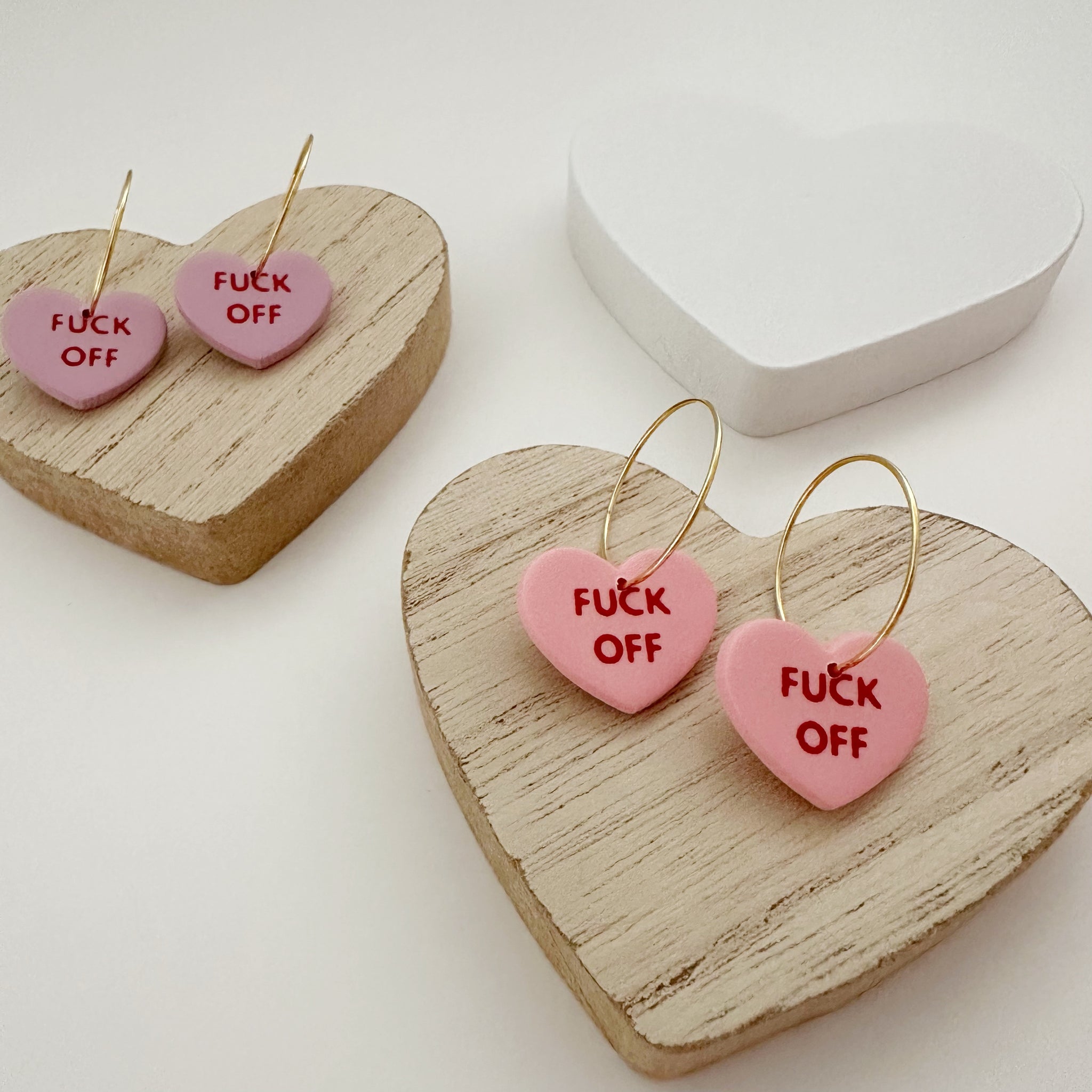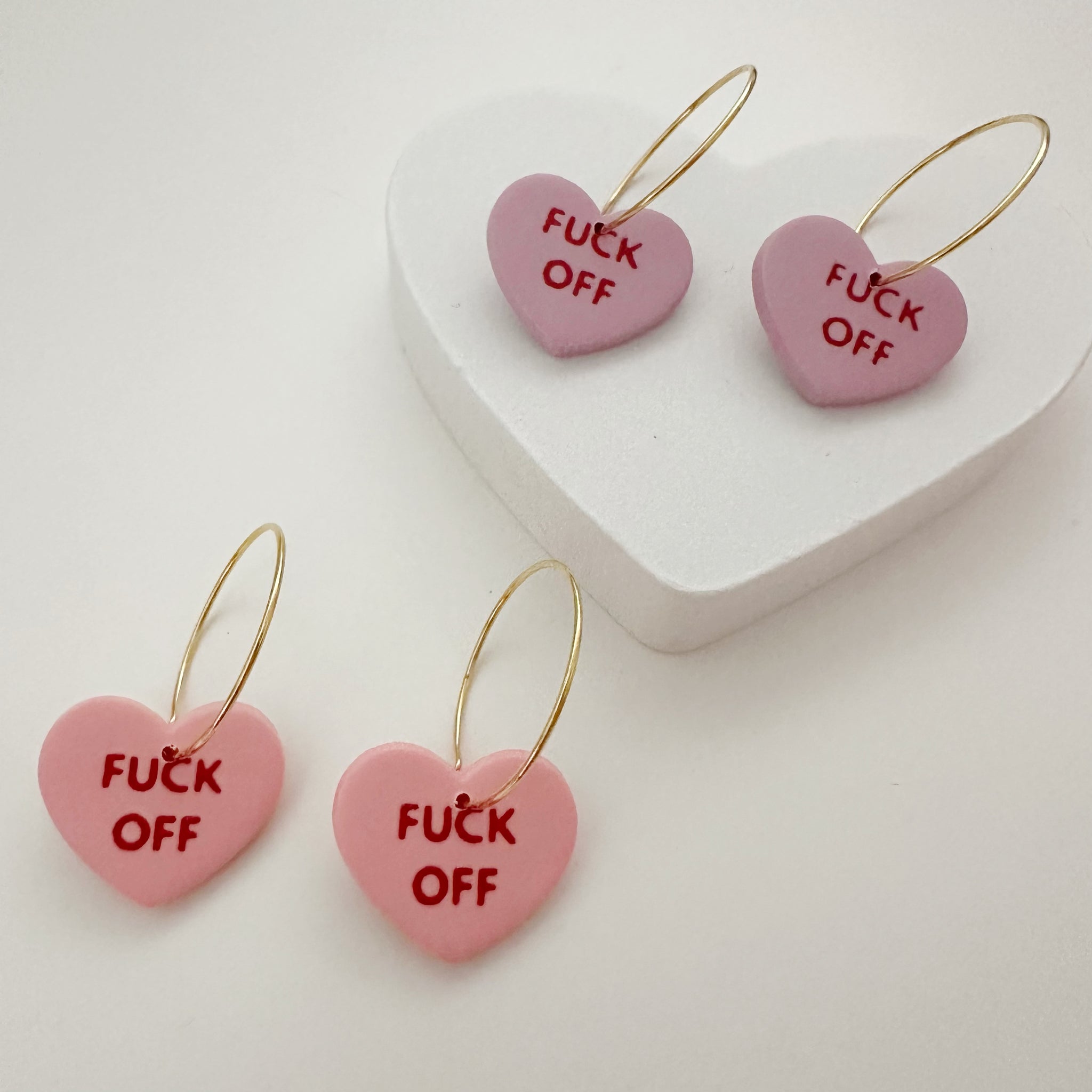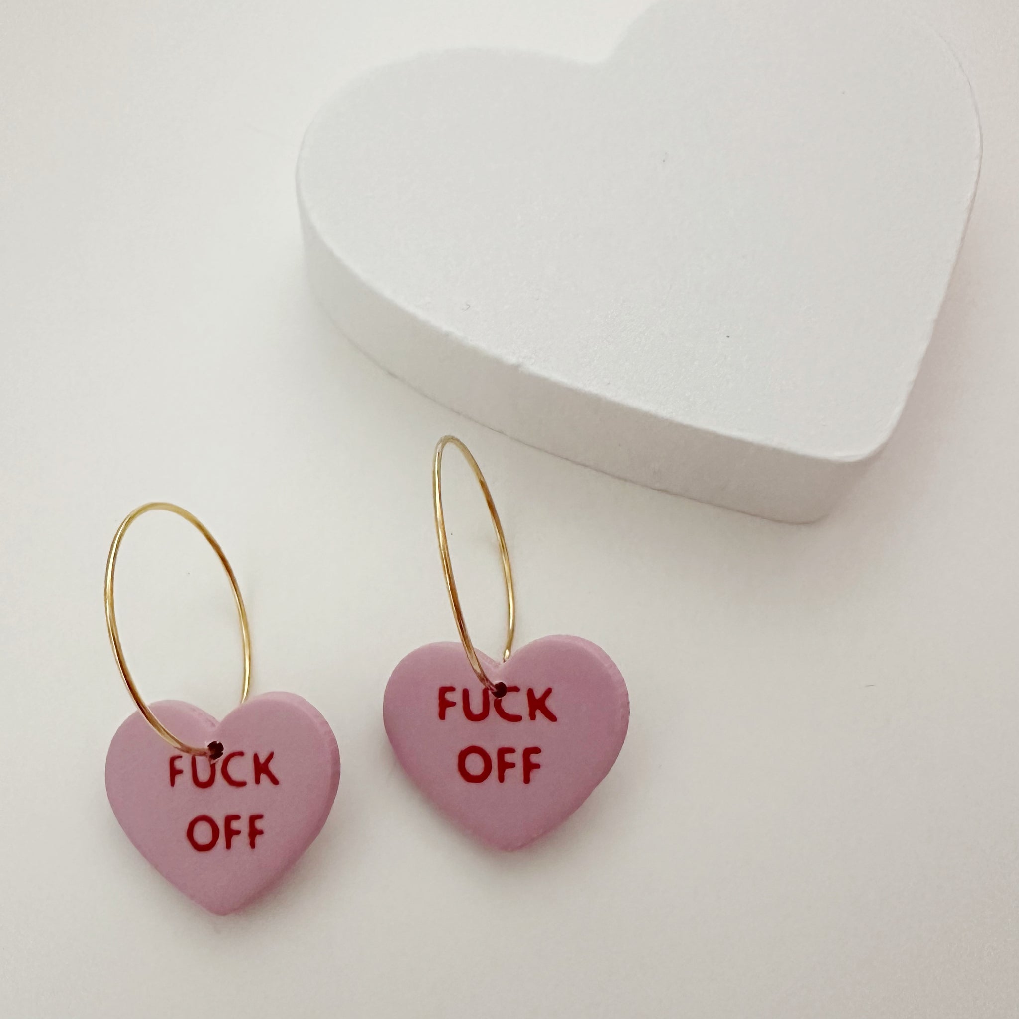 This super sassy pair of studs will feature both hearts saying "F*CK OFF" in the style of a conversation heart candy.