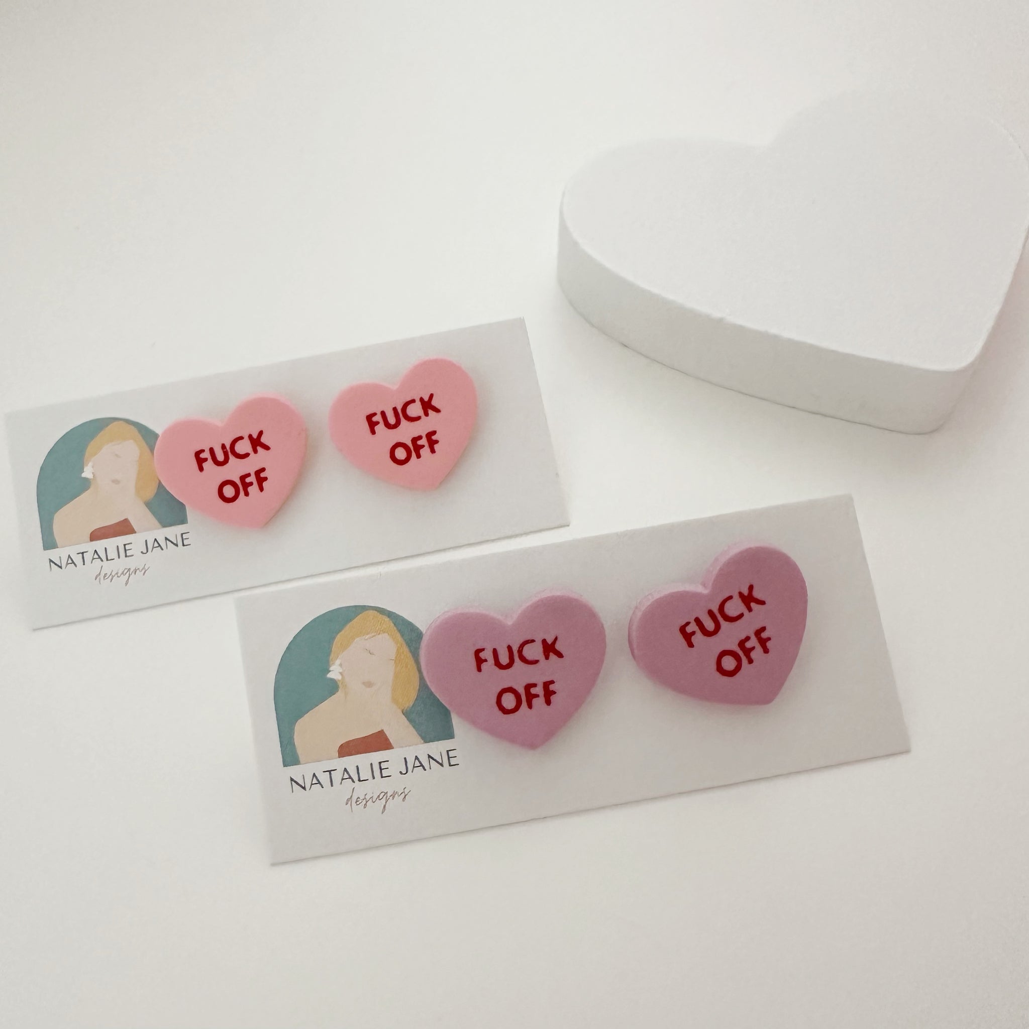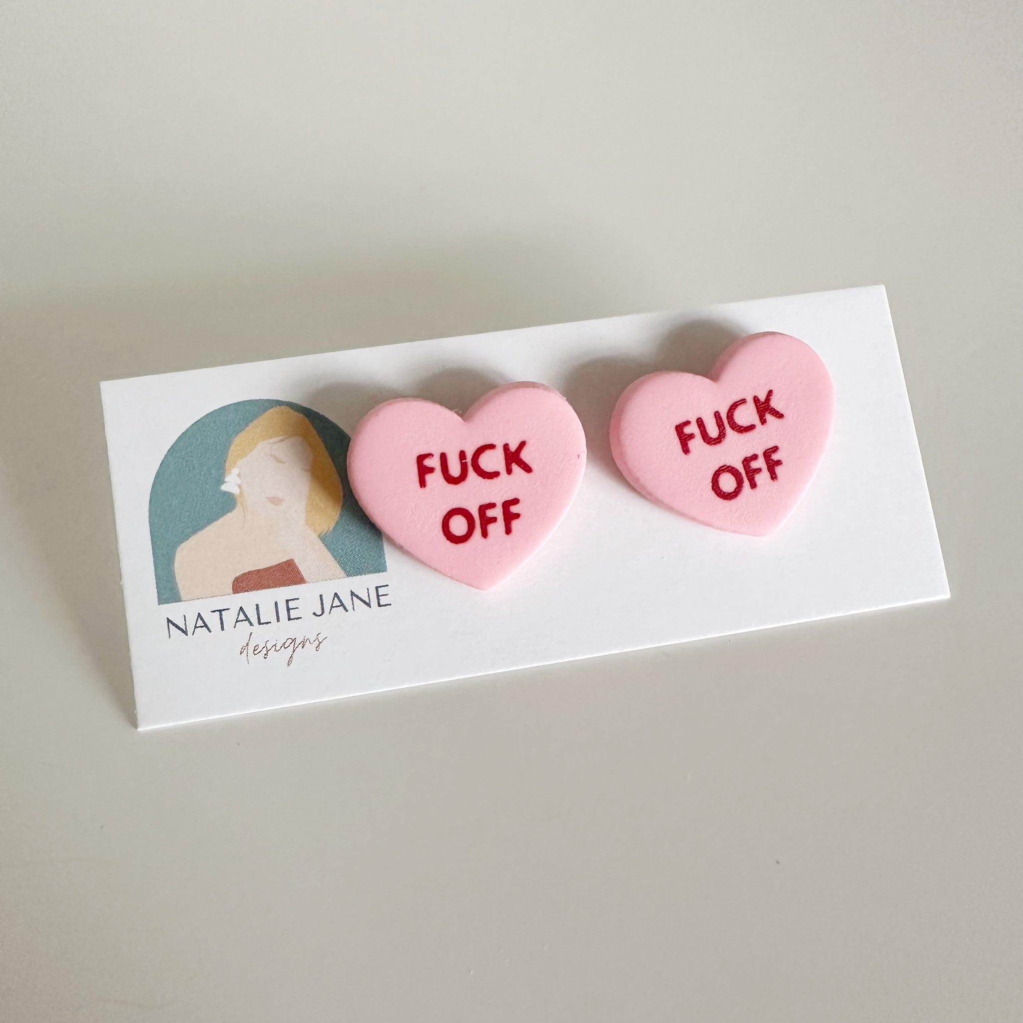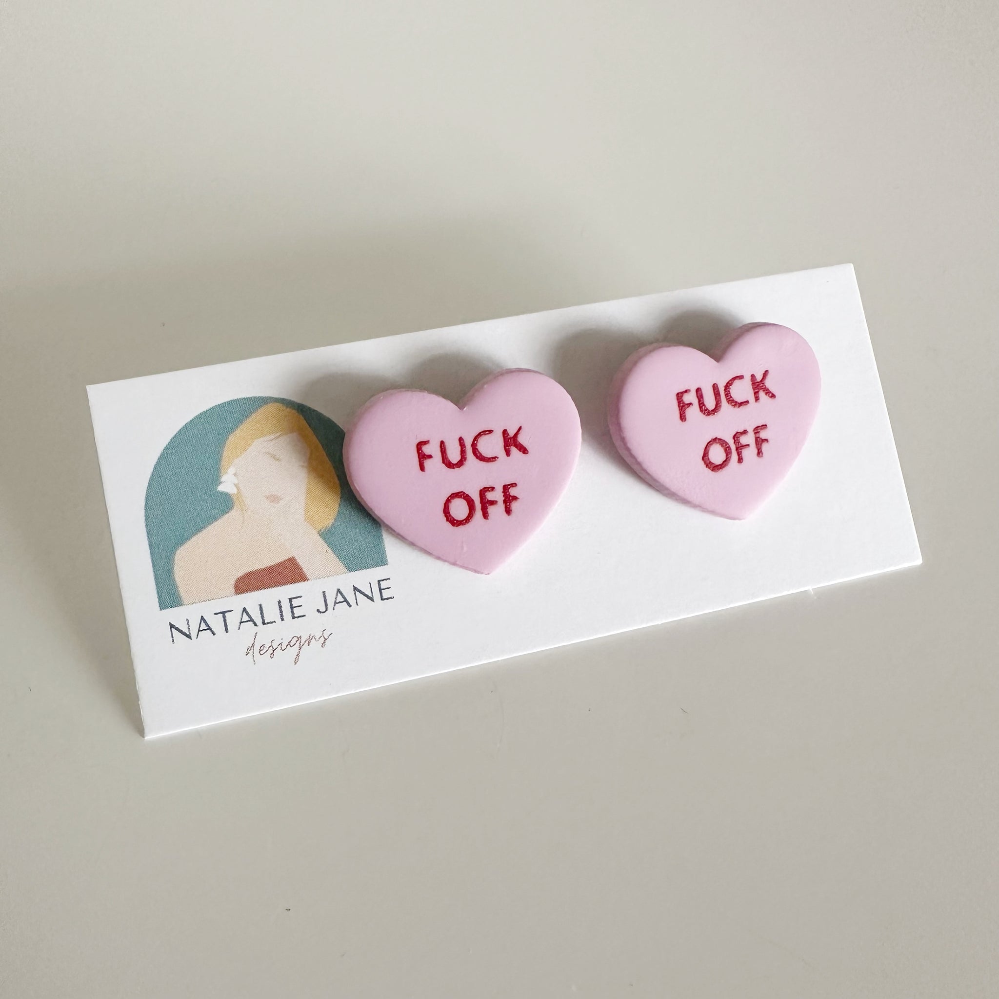 This super sassy pair of studs will feature both hearts saying "F*CK OFF" in the style of a conversation heart candy.