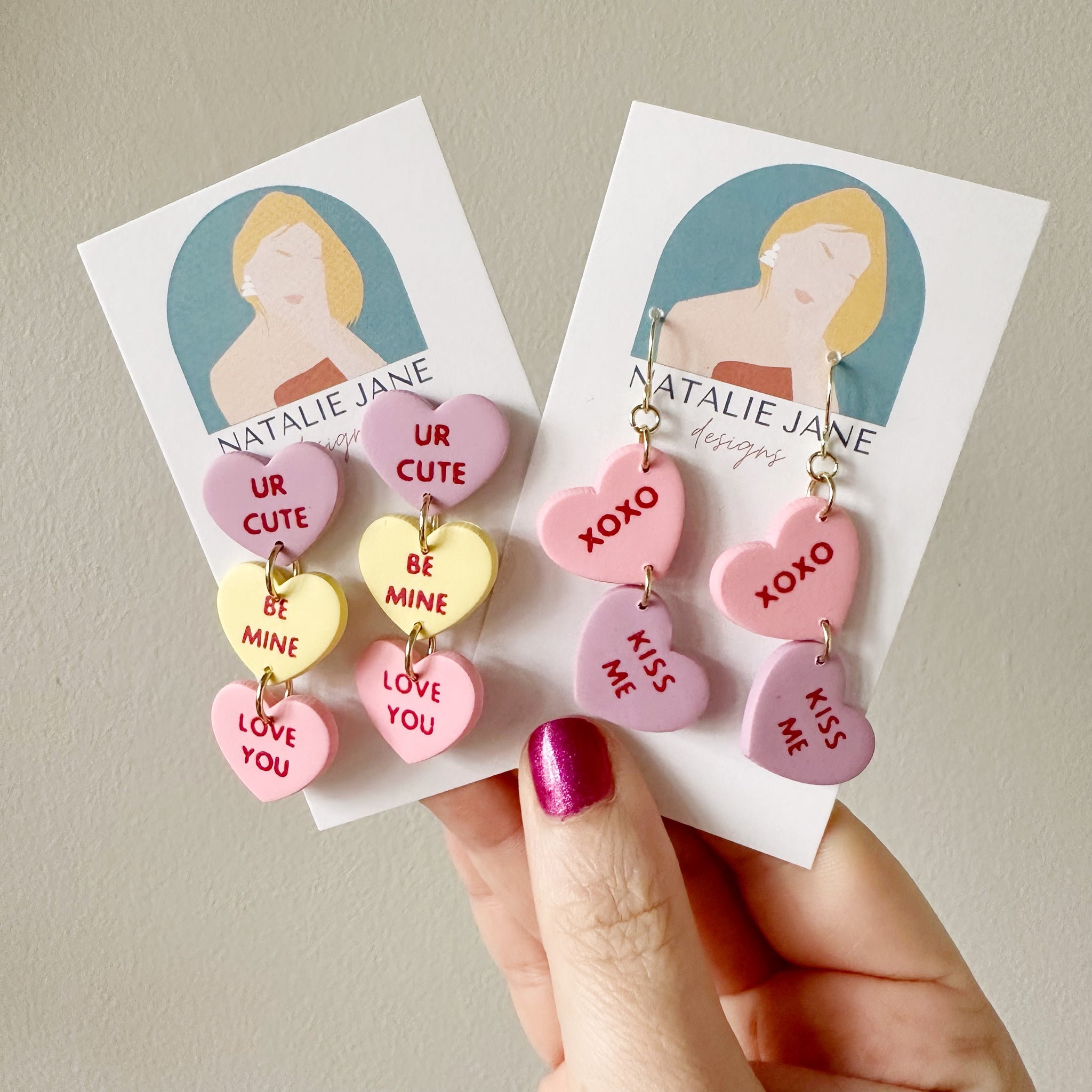 This 2 tier conversation heart dangle includes hearts that are pink and purple. Each heart color will be a different wording (like pictured).